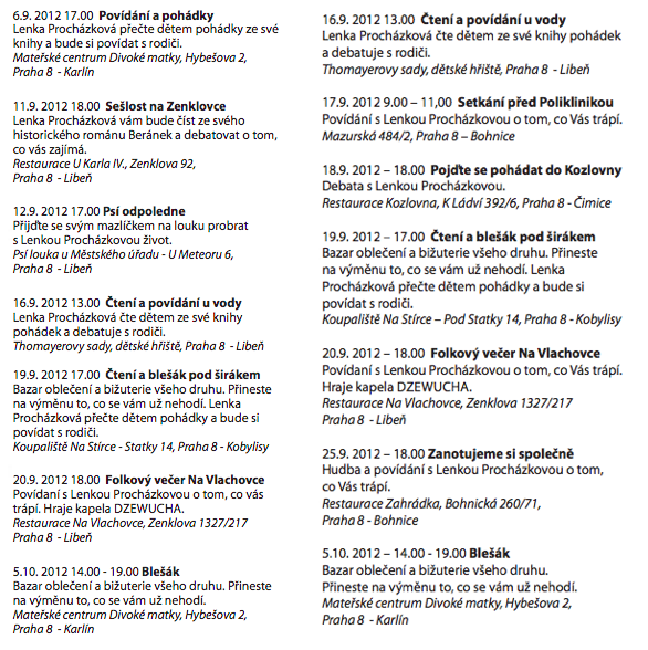 Lenka Procházková se s voliči setká například v mateřském centru Divoké matky či při folkovém večeru Na Vlachovce. Režisér Vít Olmer se představí filmovou ochutnávkou své bohaté tvorby u piva na různých místech po celém jihu Prahy.